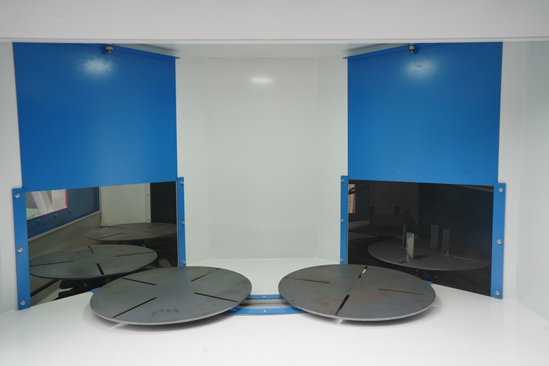 The system continuously presents small turntables into blasting station in front of blast guns for automatic processing.