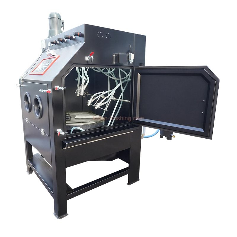 Wet blasting cabinet works through the flow of water borne abrasives, which applies a high performance pump fully agitating abrasive and water into slurry mxiture, then deliver the slurry to target surfaces through nozzle. With advantages of: